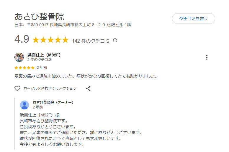 仕事上、立ち仕事で最初の頃は思うように痛みが取れなかったですが、その時の状況・状態に1つ1つ合わせてもらって、自宅で簡単に出来るマッサージなど優しくアドバイスを頂きながら通わせてもらってます。